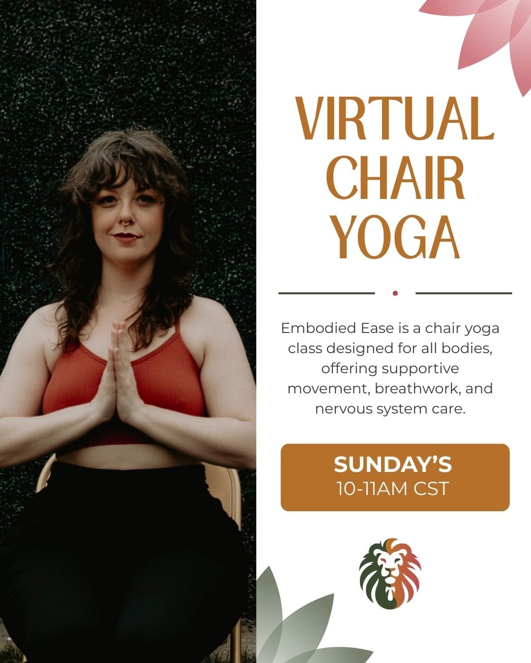 Virtual chair yoga. A gentle, accessible practice designed for all bodies and mobility levels. This virtual class invites you to experience the benefits of yoga without needing to get on the floor. Through breathwork, mindful movement, and guided relaxation, Embodied Ease helps release tension, improve circulation, and cultivate a sense of peace—all from the comfort of your chair. Whether you're looking for a practice that supports your mobility needs or simply want a softer, restorative approach to yoga, this class offers a nurturing space for you to move and breathe with ease.